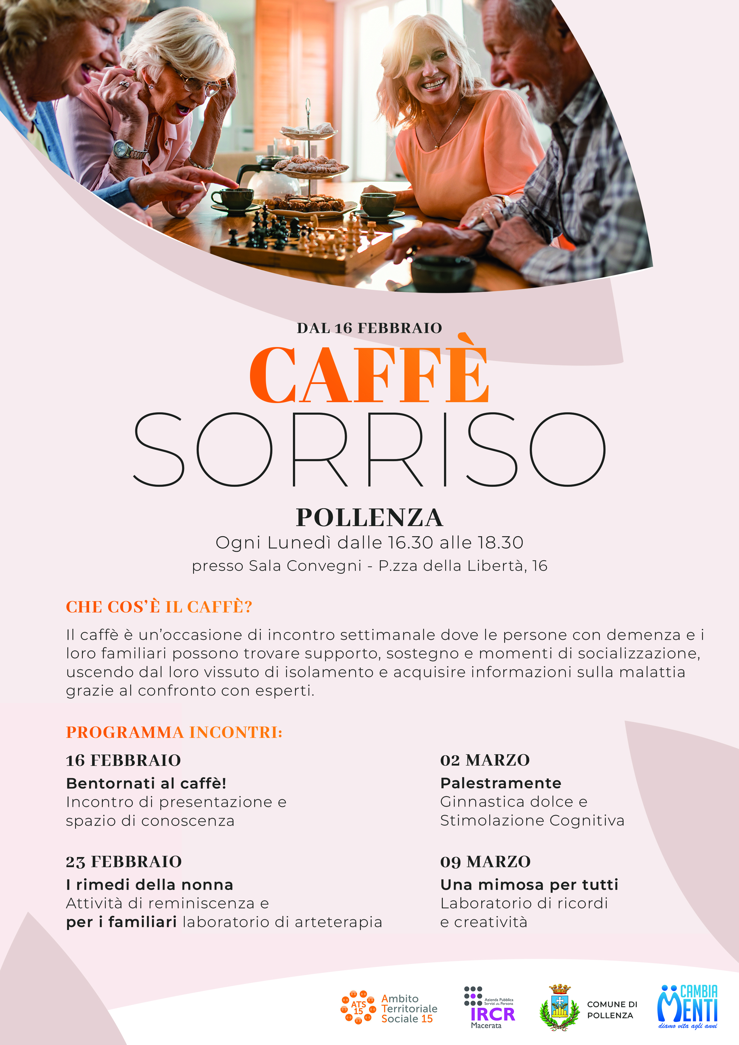 Nell’ambito del servizio “Servizi sociali di sollievo per le persone anziane non autosufficienti e le loro famiglie – livello essenziale delle prestazioni”, in capo agli ATS, l'ATS 15 organizza in collaborazione con l’APSP IRCR di Macerata i "Caffè Sorriso".