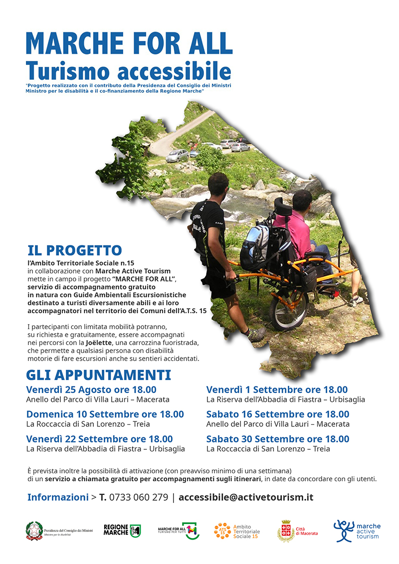 L'Ambito Territoriale Sociale n.15 in collaborazione con Marche Active Tourism mette in campo il progetto "MARCHE FOR ALL", servizio di accompagnamento gratuito in natura con Guide Ambientali Escursionistiche destinato a turismo diversamente abili e ai loro accompagnatori nel territorio dei Comuni dell'ATS 15.