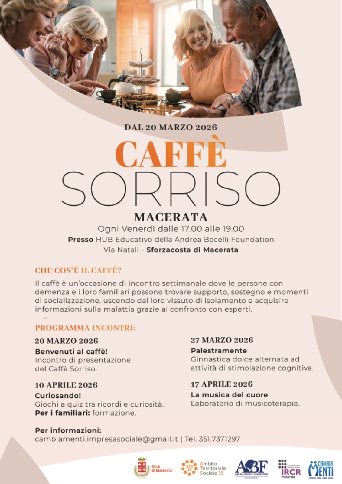Gli appuntamenti si terranno ogni venerdì, dalle 17,00 alle 19,00, nei locali dell’hub educativo ABF in via Natali a Sforzacosta - Macerata. Si parte il 20 marzo con “Benvenuti al Caffè”, incontro di presentazione al caffè sorriso. Si prosegue il 27 marzo con “Palestramente”, ginnastica dolce alternata ad attività di stimolazione cognitiva. Il 10 aprile è la volta di con “Curiosando”, giochi a quiz tra ricordi e curiosità e un momento di formazione per i familiari. Infine il 17 aprile il laboratorio di musicoterapia “La musica del cuore”.