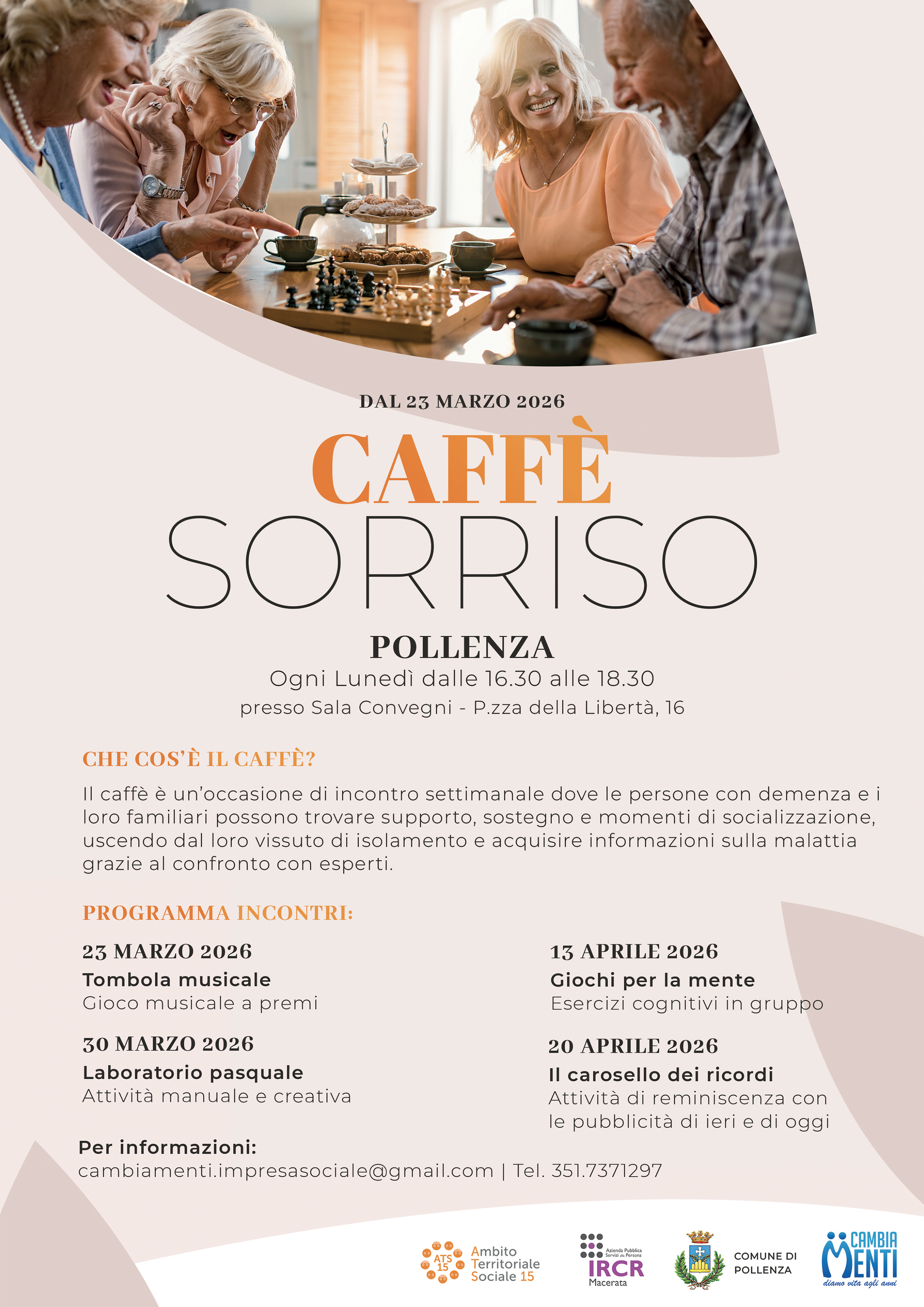 Nell’ambito del servizio “Servizi sociali di sollievo per le persone anziane non autosufficienti e le loro famiglie – livello essenziale delle prestazioni”, in capo agli ATS, l'ATS 15 organizza in collaborazione con l’APSP IRCR di Macerata i "Caffè Sorriso".