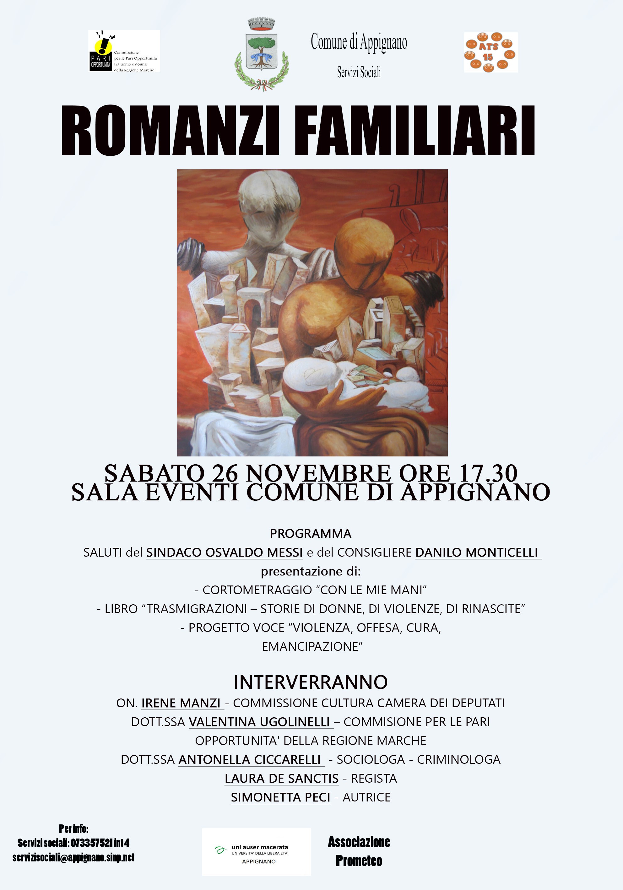 Nella settimana in cui ricorre la “Giornata Internazionale per l'Eliminazione della Violenza contro le Donne”, l’Amministrazione comunale di Appignano organizza l’evento “Romanzi familiari” , che si terrà sabato 26 novembre alle ore 17.30, presso la Sala Eventi del Palazzo Municipale sito in Piazza Umberto I, n. 13.